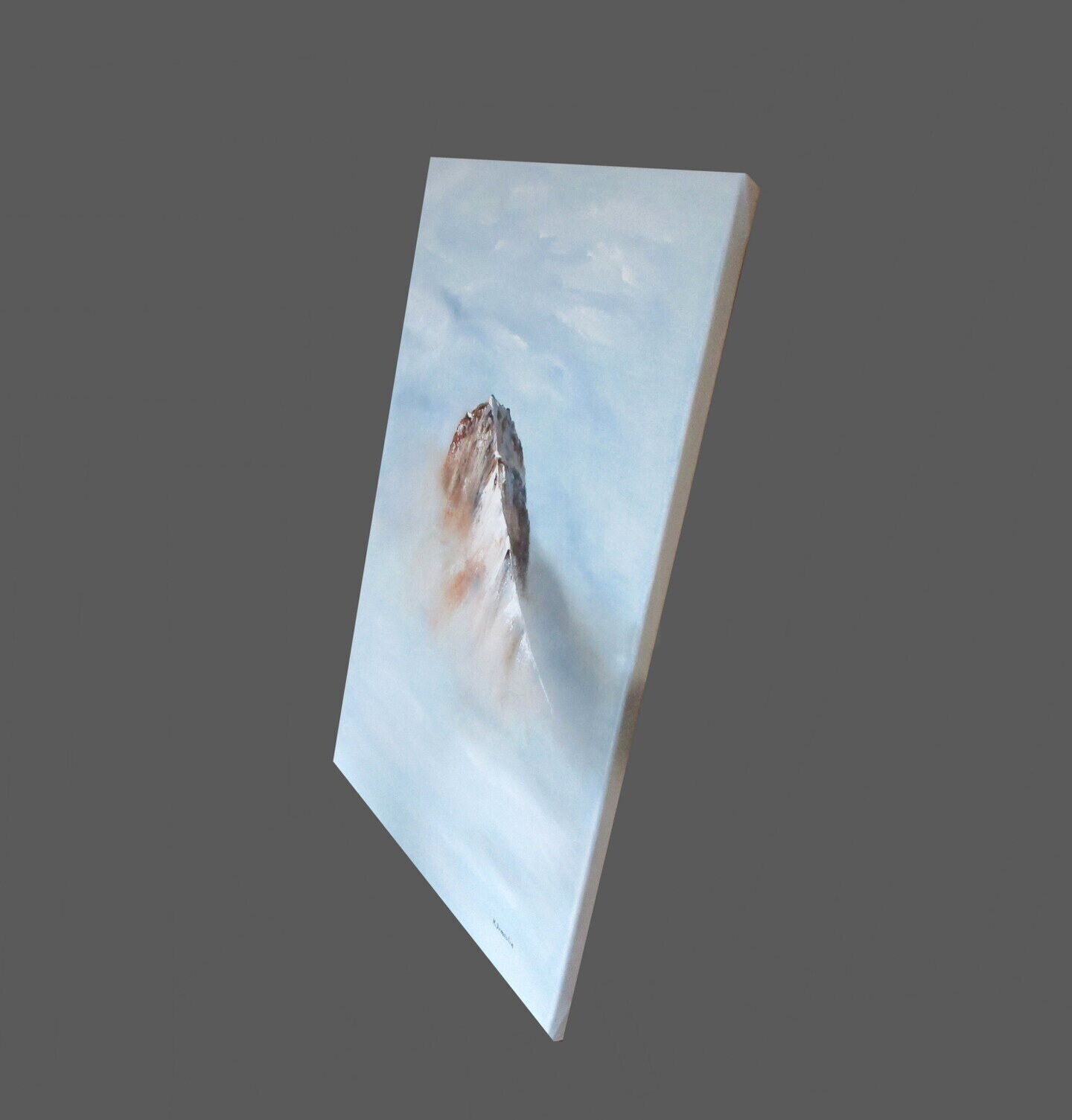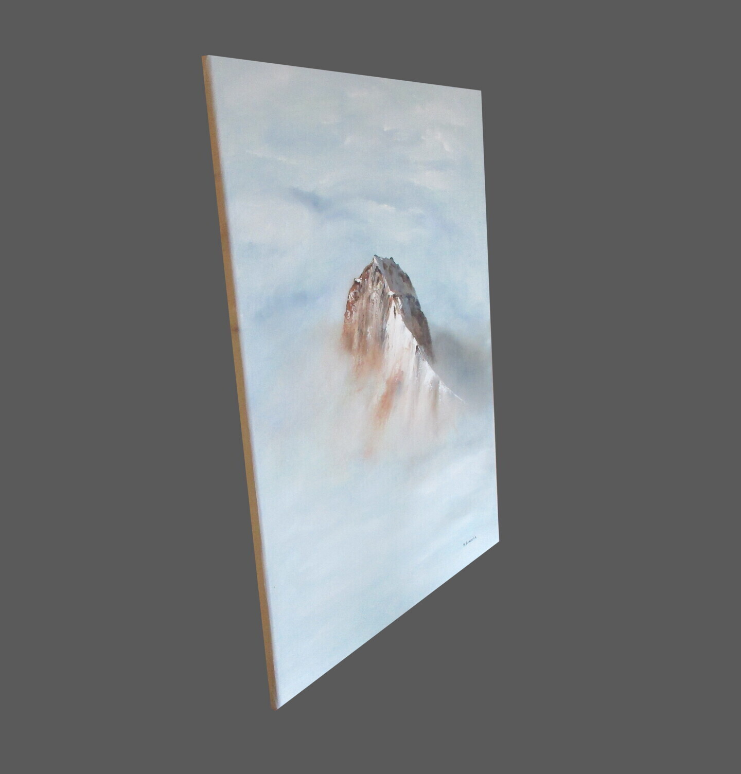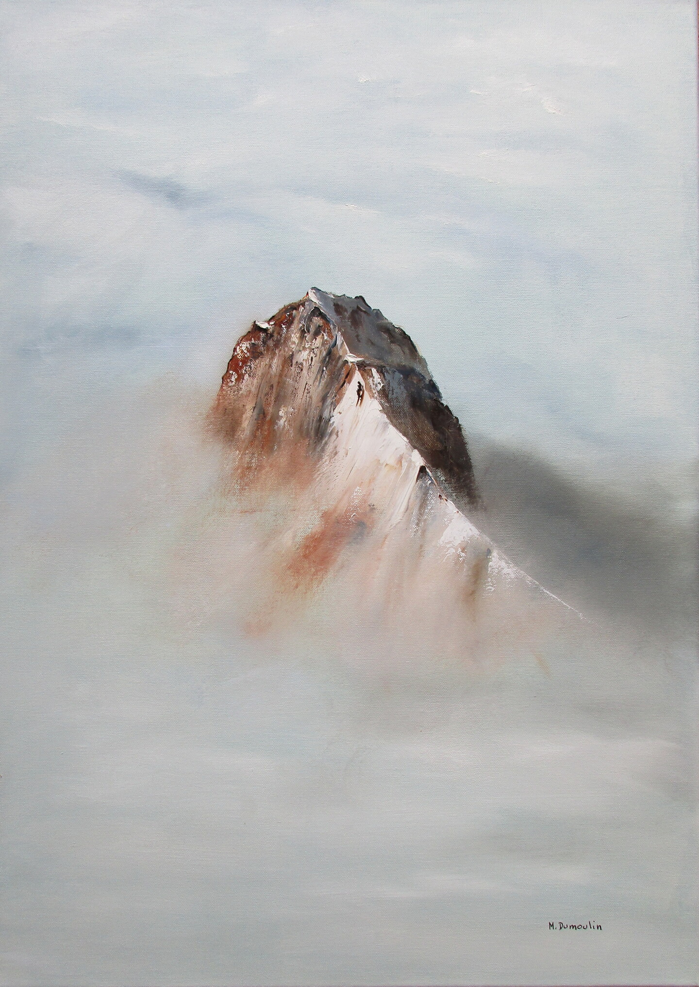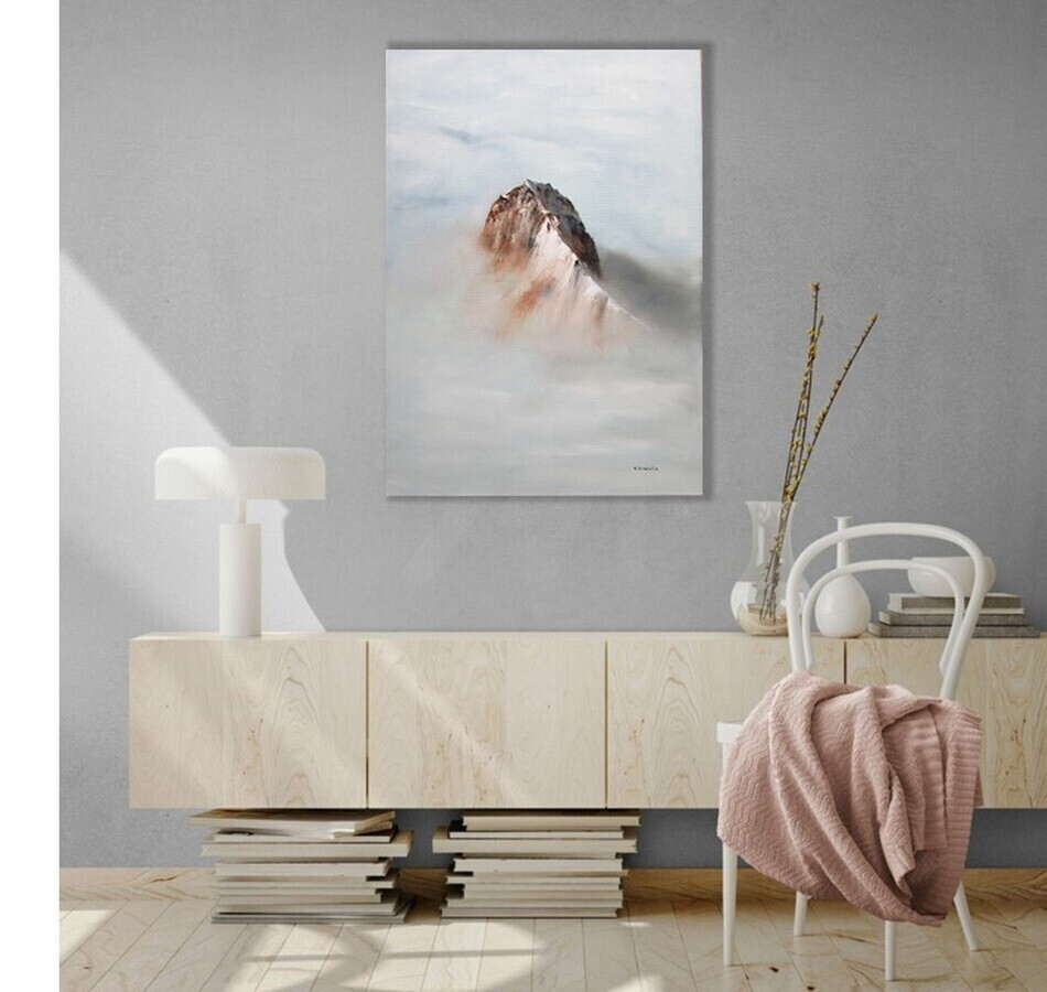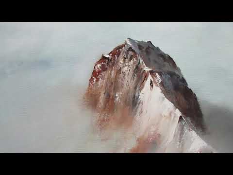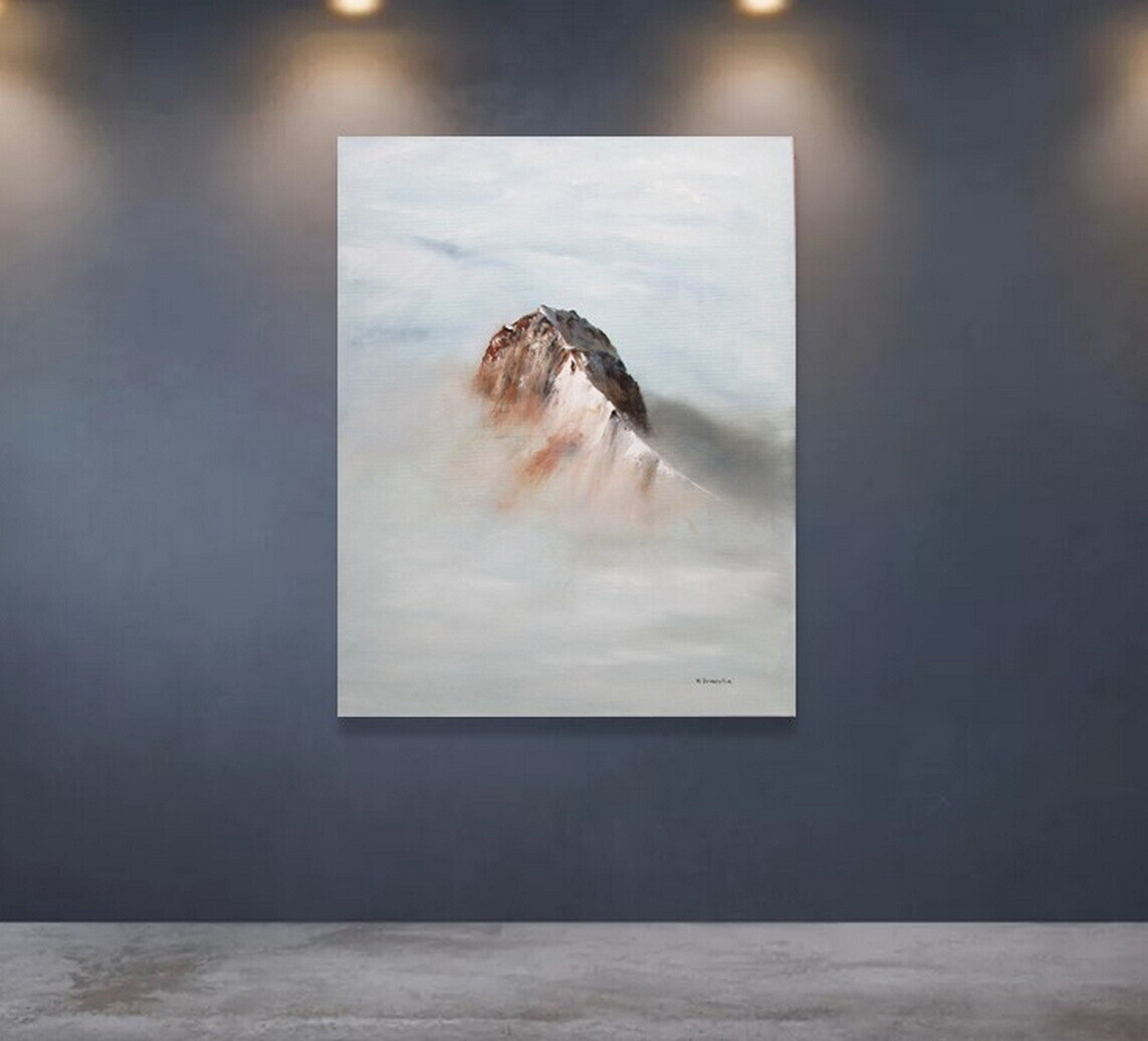 Sommet montagneux peint au couteau, émergeant des nuages et du brouillard.
